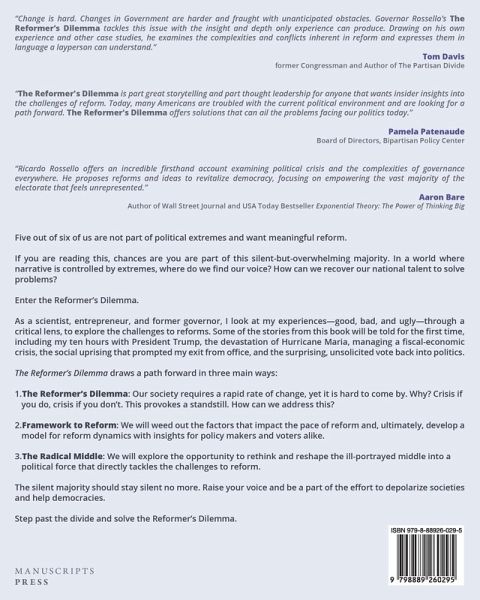 Five out of six of us are not part of political extremes and want meaningful reform. If you are reading this, chances are you are part of this silent-but-overwhelming majority. In a world where narrative is controlled by extremes, where do we find our voice? How can we recover our national talent to solve problems? Enter The Reformer's Dilemma. As a scientist, entrepreneur, and former governor, I look at my experiences-good, bad, and ugly-through a critical lens, to explore the challenges to reforms. Some of the stories from this book will be told for the first time, including my ten hours with President Trump, the devastation of Hurricane Maria, managing a fiscal-economic crisis, the social uprising that prompted my exit from office, and the surprising, unsolicited vote back into politics. The Reformer's Dilemma draws a path forward in three main ways: 1. The Reformer's Dilemma: Our society requires a rapid rate of change, yet it is hard to come by. Why? Crisis if you do, crisis if you don't. This provokes a standstill. How can we address this? 2. Framework to Reform: We will weed out the factors that impact the pace of reform and, ultimately, develop a model for reform dynamics with insights for policy makers and voters alike. 3. The Radical Middle: We will explore the opportunity to rethink and reshape the ill-portrayed middle into a political force that directly tackles the challenges to reform. The silent majority should stay silent no more. Raise your voice and be a part of the effort to depolarize societies and help democracies. Step past the divide and solve the Reformer's Dilemma.