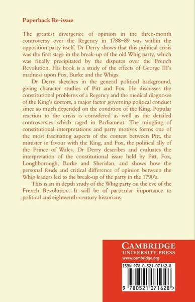 Dr Derry shows that the three-month controversy over the Regency in 1788 9 was the first stage in the break-up of the old Whig party.