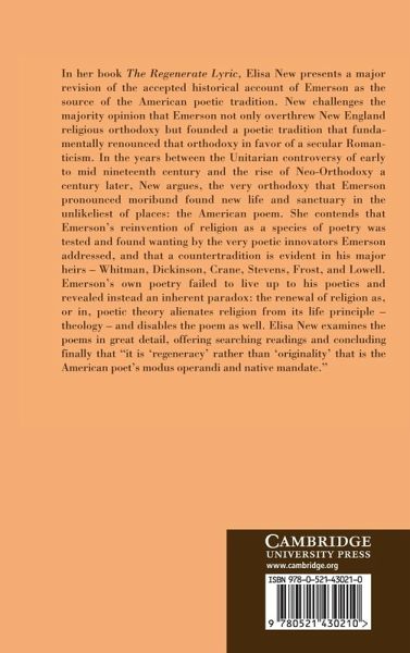 Elisa New presents a major revision of the accepted account of Emerson as the source of the American poetic tradition. New challenges the view that Emerson not only overthrew New England religious orthodoxy but founded a poetic tradition that fundamentally renounced that orthodoxy in favour of a secular, Romantic approach. She contends that Emerson's reinvention of the religion as a species of poetry is tested and found wanting by the very poetic innovators whom Emerson addressed and that a counter-tradition is evident in his major heirs - Whitman, Dickinson, Crane, Stevens, Frost and Lowell. Indeed, Emerson's own poetry failed in many ways to live up to his views and instead revealed an inherent paradox: that co-opting of religion by a poetic theory alienates religion from its life principle - theology - and disables the poem as well.