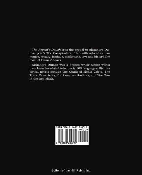 The Regent's Daughter is the sequel to Alexandre Dumas pere's The Conspirators, filled with adventure, romance, royalty, intrigue, misfortune, love and history like most of Dumas' books. Alexandre Dumas was a French writer whose works have been translated into nearly 100 languages. His historical novels include The Count of Monte Cristo, The Three Musketeers, The Corsican Brothers, and The Man in the Iron Mask.