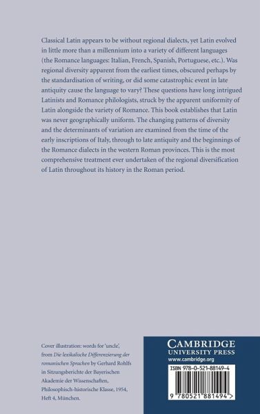 Classical Latin appears to be without regional dialects, yet Latin evolved in little more than a millennium into a variety of different languages (the Romance languages: Italian, French, Spanish, Portuguese etc.). Was regional diversity apparent from the earliest times, obscured perhaps by the standardisation of writing, or did some catastrophic event in late antiquity cause the language to vary? These questions have long intrigued Latinists and Romance philologists, struck by the apparent uniformity of Latin alongside the variety of Romance. This book establishes that Latin was never geographically uniform. The changing patterns of diversity and the determinants of variation are examined from the time of the early inscriptions of Italy, through to late antiquity and the beginnings of the Romance dialects in the western Roman provinces. This is the most comprehensive treatment ever undertaken of the regional diversification of Latin throughout its history in the Roman period.