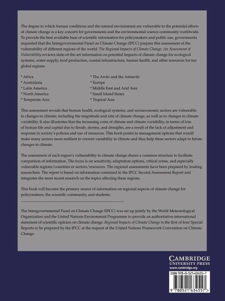 The degree to which human conditions and the natural environment are vulnerable to the potential effects of climate change is a key concern for governments and the environmental science community worldwide. This book from the Intergovernmental Panel on Climate Change (IPCC) provides the best available base of scientific information for policymakers and public use. The Regional Impacts of Climate Change: An Assessment of Vulnerability, first published in 1998, reviews information on potential impacts of climate change for ecological systems, water supply, food production, coastal infrastructure, human health, and other resources for ten global regions. It also illustrates that the increasing costs of climate and climate variability, in terms of loss of human life and capital due to floods, storms, and droughts, are a result of the lack of adjustment and response in society's policies and use of resources. This book points to management options that would make many sectors more resilient to current variability in climate and thus help these sectors adapt to future changes in climate.