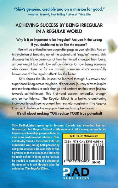Why is it so important to be irregular? Are you in the wrong if you decide not to be like the masses? You will be enticed to turn page after page as you join Shiv Rad on his evolution of breaking out of the societal and "regular" norms. Shiv discusses his life experiences of how he himself changed from being an overweight kid with low self-confidence to now being someone who doesn't take no for an answer; someone who's successfully broken out of "the regular effect" for the better. Shiv shares the life lessons he learned through his travels and experience living across the globe. His personal journey aims to inspire and motivate others to seek change and embark on their own journey towards self-fulfilment. This first-hand account embodies strength and self-confidence. 'The Regular Effect' is a battle, championing individuality and freeing oneself from societal constraints. The Regular Effect will challenge the way you think and disrupt self-doubt. It's all about making YOU realize YOUR true potential!