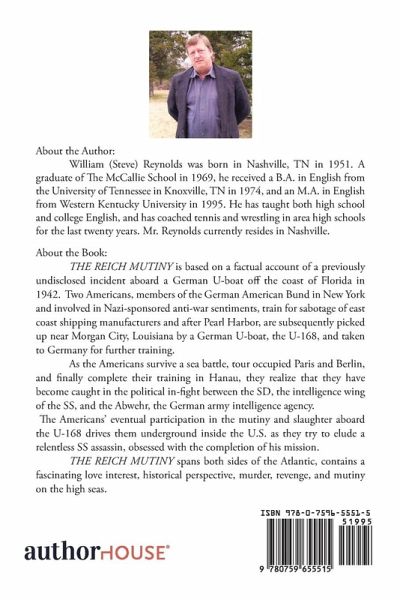 About the Book: THE REICH MUTINY is based on a factual account of a previously undisclosed incident aboard a German U-boat o the coast of Florida in 1942. Two Americans, members of the German American Bund in New York and involved in Nazi-sponsored anti-war sentiments, train for sabotage of east coast shipping manufacturers and after Pearl Harbor, are subsequently picked up near Morgan City, Louisiana by a German U-boat, the U-168, and taken to Germany for further training. As the Americans survive a sea battle, tour occupied Paris and Berlin, and nally complete their training in Hanau, they realize that they have become caught in the political in- ght between the SD, the intelligence wing of the SS, and the Abwehr, the German army intelligence agency. e Americans' eventual participation in the mutiny and slaughter aboard the U-168 drives them underground inside the U.S. as they try to elude a relentless SS assassin, obsessed with the completion of his mission. THE REICH MUTINY spans both sides of the Atlantic, contains a fascinating love interest, historical perspective, murder, revenge, and mutiny on the high seas.