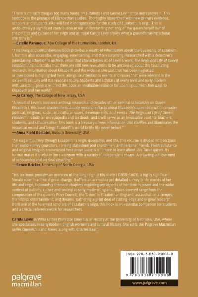 "This is an accessible volume which packs in enormous quantities of information about the queen and her reign in a well-organised, readable, form and includes interesting and engaging nuances and perspectives beyond politics and religion. It will be invaluable not just to students but to any reader wishing to understand Elizabeth's reign, and the mentalités of the queen, her councillors, and courtiers." (Melita Thomas, Royal Studies Journal, Vol. 11 (1), 2024)