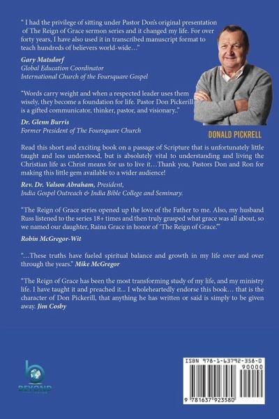 "I had the privilege of sitting under Pastor Don's original presentation of The Reign of Grace sermon series and it changed my life. For over forty years, I have also used it in transcribed manuscript format to teach hundreds of believers world-wide. The impact on their lives has consistently been life changing too as Pastor Don opens the deep theological truths of Romans 6-8 in an easily understood and practically applied way. I cannot say enough about this series." Gary Matsdorf Global Education Coordinator International Church of the Foursquare Gospel "Words carry weight and when a respected leader uses them wisely, they become a foundation for life. Pastor Don Pickerill is a gifted communicator, thinker, pastor, and visionary. He doesn't just see behind what most people see, he sees it before they do, as well. Long before the word grace became a buzzword in modern Christendom, Pastor Pickerill was teaching it, living it and practicing it. His words have great meaning because they emerge from a rich life of experience and wisdom. Grace is God's platform of restoration and redemption. Don Pickerill has known that and has been a recipient of it. So have we all." Dr. Glenn Burris Former President of The Foursquare Church "Read this short and exciting book on a passage of Scripture that is unfortunately little taught and less understood, but is absolutely vital to understanding and living the Christian life as Christ means for us to live it. It makes no difference whether you have been a believing Christian for decades or whether you just began your life with Christ last week, or whether you are seeking to understand what Christianity is all about--there is something important and vital for everyone who is in need of a more mature faith. That's all of us. Thank you, Pastors Don and Ron for making this little gem available to a wider audience!" Rev. Dr. VALSON ABRAHAM, President, India Gospel Outreach & India Bible College and Seminary. "The Reign of Grace series opened up the love of the Father to me. Also, my husband Russ listened to the series 18+ times and then truly grasped what grace was all about, so we named our daughter, Raina Grace in honor of 'The Reign of Grace.'" Robin McGregor-Witt "I was a new Christian and began attending Italian Christian Assembly in Los Angeles a few months before my uncle Don Pickerill began the "Reign of Grace" series. What a gift it was to my soul to have the grace of God taught to me as I began my journey of faith. A life changing foundational teaching that helped me trust in the goodness of the Lord thru every storm and trial, but also gave me the confidence to "enter the throne of grace" knowing He loved me as a son in spite of my many failures as a new Christian. These truths have fueled spiritual balance and growth in my life over and over through the years." Mike McGregor "The Reign of Grace has been the most transforming study of my life, and my ministry life. I have taught it and preached it... I wholeheartedly endorse this book. At "CA" with Don for 9 years, during and after LIFE, everything he taught was of great import. Later, I simply called him the best preacher of theology have ever known or heard. Over now more than 40 years in ministry, I remain in contact with Don, and each time I visit, he "blesses my socks off". At the most recent visit, Don had put out a whole treasure of his works, and offered I take anything I could use. I took much. That is the enduring character of Don Pickerill, that anything he has written or said is simply to be given away." Jim Cosby