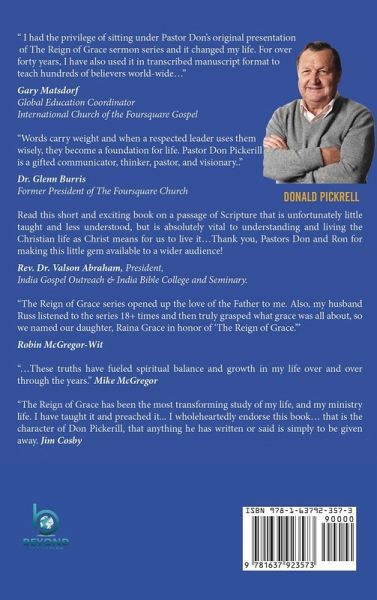 "I had the privilege of sitting under Pastor Don's original presentation of The Reign of Grace sermon series and it changed my life. For over forty years, I have also used it in transcribed manuscript format to teach hundreds of believers world-wide. The impact on their lives has consistently been life changing too as Pastor Don opens the deep theological truths of Romans 6-8 in an easily understood and practically applied way. I cannot say enough about this series." Gary Matsdorf Global Education Coordinator International Church of the Foursquare Gospel "Words carry weight and when a respected leader uses them wisely, they become a foundation for life. Pastor Don Pickerill is a gifted communicator, thinker, pastor, and visionary. He doesn't just see behind what most people see, he sees it before they do, as well. Long before the word grace became a buzzword in modern Christendom, Pastor Pickerill was teaching it, living it and practicing it. His words have great meaning because they emerge from a rich life of experience and wisdom. Grace is God's platform of restoration and redemption. Don Pickerill has known that and has been a recipient of it. So have we all." Dr. Glenn Burris Former President of The Foursquare Church "Read this short and exciting book on a passage of Scripture that is unfortunately little taught and less understood, but is absolutely vital to understanding and living the Christian life as Christ means for us to live it. It makes no difference whether you have been a believing Christian for decades or whether you just began your life with Christ last week, or whether you are seeking to understand what Christianity is all about--there is something important and vital for everyone who is in need of a more mature faith. That's all of us. Thank you, Pastors Don and Ron for making this little gem available to a wider audience!" Rev. Dr. VALSON ABRAHAM, President, India Gospel Outreach & India Bible College and Seminary. "The Reign of Grace series opened up the love of the Father to me. Also, my husband Russ listened to the series 18+ times and then truly grasped what grace was all about, so we named our daughter, Raina Grace in honor of 'The Reign of Grace.'" Robin McGregor-Witt "I was a new Christian and began attending Italian Christian Assembly in Los Angeles a few months before my uncle Don Pickerill began the "Reign of Grace" series. What a gift it was to my soul to have the grace of God taught to me as I began my journey of faith. A life changing foundational teaching that helped me trust in the goodness of the Lord thru every storm and trial, but also gave me the confidence to "enter the throne of grace" knowing He loved me as a son in spite of my many failures as a new Christian. These truths have fueled spiritual balance and growth in my life over and over through the years." Mike McGregor "The Reign of Grace has been the most transforming study of my life, and my ministry life. I have taught it and preached it... I wholeheartedly endorse this book. At "CA" with Don for 9 years, during and after LIFE, everything he taught was of great import. Later, I simply called him the best preacher of theology have ever known or heard. Over now more than 40 years in ministry, I remain in contact with Don, and each time I visit, he "blesses my socks off". At the most recent visit, Don had put out a whole treasure of his works, and offered I take anything I could use. I took much. That is the enduring character of Don Pickerill, that anything he has written or said is simply to be given away." Jim Cosby