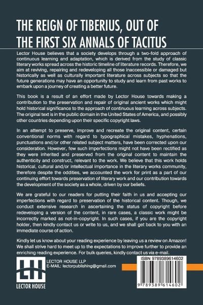 The Reign Of Tiberius, Out Of The First Six Annals Of Tacitus: With His Account Of Germany, And Life Of Agricola, Translated By Thomas Gordon, Edited By Arthur Galton This book is a result of an effort made by us towards making a contribution to the preservation and repair of original classic literature. In an attempt to preserve, improve and recreate the original content, we have worked towards: 1. Type-setting & Reformatting: The complete work has been re-designed via professional layout, formatting and type-setting tools to re-create the same edition with rich typography, graphics, high quality images, and table elements, giving our readers the feel of holding a 'fresh and newly' reprinted and/or revised edition, as opposed to other scanned & printed (Optical Character Recognition - OCR) reproductions. 2. Correction of imperfections: As the work was re-created from the scratch, therefore, it was vetted to rectify certain conventional norms with regard to typographical mistakes, hyphenations, punctuations, blurred images, missing content/pages, and/or other related subject matters, upon our consideration. Every attempt was made to rectify the imperfections related to omitted constructs in the original edition via other references. However, a few of such imperfections which could not be rectified due to intentional\unintentional omission of content in the original edition, were inherited and preserved from the original work to maintain the authenticity and construct, relevant to the work. We believe that this work holds historical, cultural and/or intellectual importance in the literary works community, therefore despite the oddities, we accounted the work for print as a part of our continuing effort towards preservation of literary work and our contribution towards the development of the society as a whole, driven by our beliefs. We are grateful to our readers for putting their faith in us and accepting our imperfections with regard to preservation of the historical content. HAPPY READING!
