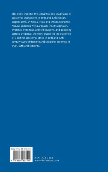 The book explores the semantics and pragmatics of epistemic expressions in 16th and 17th century English: verily, in faith, I ween and others. Using the Natural Semantic Metalanguage (NSM) approach, evidence from texts and collocations, and adducing cultural evidence, the work argues for the existence of a distinct epistemic ethos in 16th and 17th centuryways of thinking and speaking, an ethos of truth, faith, and certainty.