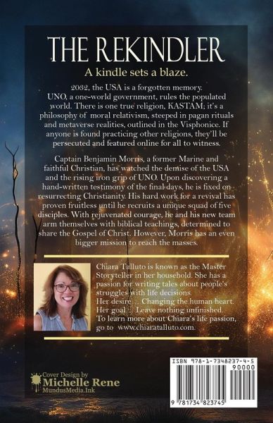 Truth has a price, but a kindle sets a blaze. 2032, the USA is a forgotten memory. UNO, a one-world government, rules the populated world. There is one true religion, KASTAM; it's a philosophy of moral relativism, steeped in pagan rituals and metaverse realities, as outlined in the Visphonice. If anyone is caught practicing any other religion, he or she will be persecuted and featured online for all to witness. Captain Benjamin Morris, a former Marine and faithful Christian, has watched the demise of the USA and the rising iron grip of UNO. Upon discovering a hand-written testimony of the final days, he is fixed on resurrecting Christianity. His hard work for a revival has proven fruitless until he recruits a unique squad of five disciples to help him. With rejuvenated courage, he, and his new team arm themselves with biblical teachings, determined to spreading the Gospel of Christ. However, Morris has an even bigger mission in mind to reach the masses.