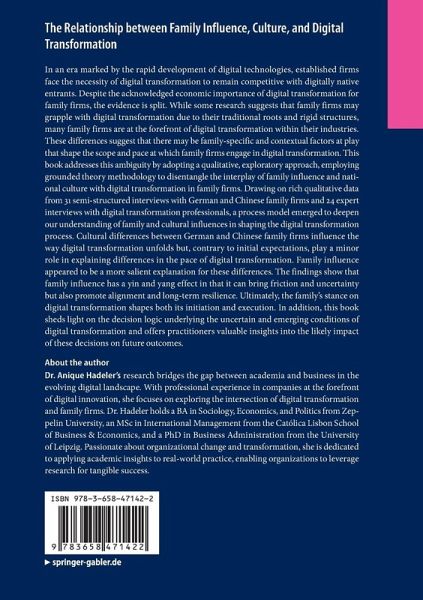 In an era marked by the rapid development of digital technologies, established firms face the necessity of digital transformation to remain competitive with digitally native entrants. Despite the acknowledged economic importance of digital transformation for family firms, the evidence is split. While some research suggests that family firms may grapple with digital transformation due to their traditional roots and rigid structures, many family firms are at the forefront of digital transformation within their industries. These differences suggest that there may be family-specific and contextual factors at play that shape the scope and pace at which family firms engage in digital transformation. This book addresses this ambiguity by adopting a qualitative, exploratory approach, employing grounded theory methodology to disentangle the interplay of family influence and national culture with digital transformation in family firms. Drawing on rich qualitative data from 31 semi-structured interviews with German and Chinese family firms and 24 expert interviews with digital transformation professionals, a process model emerged to deepen our understanding of family and cultural influences in shaping the digital transformation process. Cultural differences between German and Chinese family firms influence the way digital transformation unfolds but, contrary to initial expectations, play a minor role in explaining differences in the pace of digital transformation. Family influence appeared to be a more salient explanation for these differences. The findings show that family influence has a yin and yang effect in that it can bring friction and uncertainty but also promote alignment and long-term resilience. Ultimately, the family's stance on digital transformation shapes both its initiation and execution. In addition, this book sheds light on the decision logic underlying the uncertain and emerging conditions of digital transformation and offers practitioners valuable insights into the likely impact of these decisions on future outcomes.