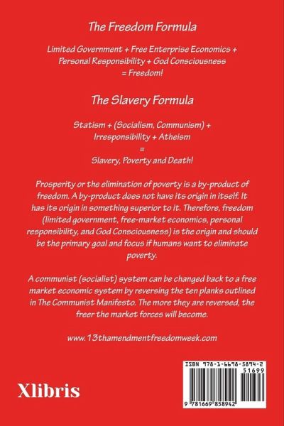 The Freedom Formula Limited Government + Free Enterprise Economics + Personal Responsibility + God Consciousness = Freedom! The Slavery Formula Statism + (Socialism, Communism) + Irresponsibility + Atheism = Slavery, Poverty and Death! Prosperity or the elimination of poverty is a by-product of freedom. A by-product does not have its origin in itself. It has its origin in something superior to it. Therefore, freedom (limited government, free-market economics, personal responsibility, and God Consciousness) is the origin and should be the primary goal and focus if humans want to eliminate poverty. A communist (socialist) system can be changed back to a free market economic system by reversing the ten planks outlined in The Communist Manifesto. The more they are reversed, the freer the market forces will become. www.13thamendmentfreedomweek.com