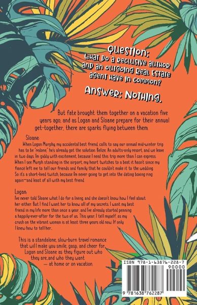 Question: What do a reclusive author and an outgoing travel agent have in common? Answer: Nothing. But fate brought them together on a vacation five years ago, and as Logan and Sloane prepare for their annual get-together, there are sparks flying between them. Sloane: When Logan Murphy, my accidental best friend, calls to say our annual mid-winter trip has to be "redone," he's already got the solution. Belize. An adults-only resort, and we leave in two days. I'm giddy with excitement, because I need this trip more than I can express. When I see Murph standing in the airport, my heart twitches to a beat it hasn't since my fiancé left me to tell our friends and family that he couldn't make it to the wedding. So it's a short-lived twitch, because I'm never going to get into the dating boxing ring again-and least of all with my best friend. Logan: I've never told Sloane what I do for a living, and she doesn't know how I feel about her either. But I want her to know all of my secrets. I want my best friend in my life more than once a year, and I've already started penning a happily-ever-after for the two of us. This year, I tell myself, as my crush on the vibrant woman is at least two years old now. If only I knew how to tell her... This is a standalone, slow-burn travel romance that will make you smile, gasp, and cheer for Logan and Sloane as they figure out who they are...and who they want-at home or on vacation. For fans of BEACH READ and THE PEOPLE WE MEET ON VACATION by Emily Henry, THE LAYOVER by Lacie Waldon, or THE UNHONEYMOONERS by Christina Lauren.