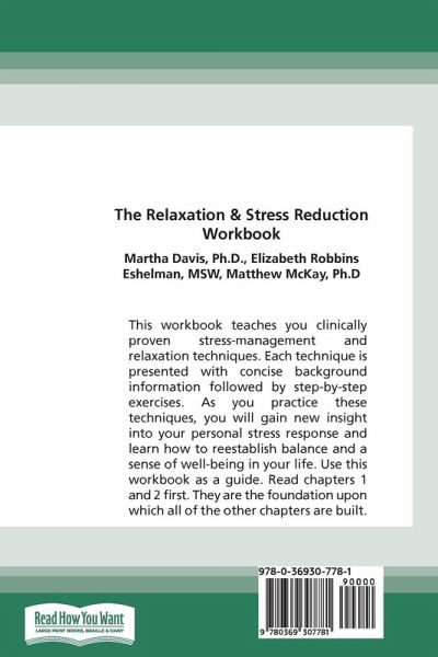 This workbook teaches you clinically proven stress-management and relaxation techniques. Each technique is presented with concise background information followed by step-by-step exercises. As you practice these techniques, you will gain new insight into your personal stress response and learn how to reestablish balance and a sense of well-being in your life. Use this workbook as a guide. Read chapters 1 and 2 first. They are the foundation upon which all of the other chapters are built. Then you will know enough about stress and your personal reactions to stress to decide which chapters will be most helpful for you to read next. Chapters 3 through 10 teach techniques for relaxation. Chapters 11 through 15 will help you with your stressful thoughts and feelings. Chapter 16 assists you in managing your time more effectively so that you can free up time to relax and do more of what is most important to you. From chapter 17 you can learn to communicate more assertively and chapter 18 gives you many options to deal with environmental and interpersonal stress at work. Chapters 19 and 20 teach the basics of nutrition and exercise. Chapter 21 gives you some suggestions on how to increase motivation, deal with problems that come up along the way, and stick to your plan. Stress and tension are present in your life every day. Stress management and relaxation can be effective only if you make them a daily part of your lifestyle. As you are learning the skills in this book that are pertinent to you, practice them repeatedly to ensure that you will be able to carry them out anytime you need to, without having to refer to written materials. Regular conscious practice can lead to habits of regular relaxation and stress reduction at an unconscious level.
