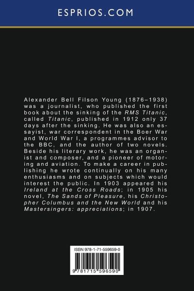 Alexander Bell Filson Young (1876-1938) was a journalist, who published the first book about the sinking of the RMS Titanic, called Titanic, published in 1912 only 37 days after the sinking. He was also an essayist, war correspondent in the Boer War and World War I, a programmes advisor to the BBC, and the author of two novels. Beside his literary work, he was an organist and composer, and a pioneer of motoring and aviation. To make a career in publishing he wrote continually on his many enthusiasms and on subjects which would interest the public. In 1903 appeared his Ireland at the Cross Roads; in 1905 his novel, The Sands of Pleasure, his Christopher Columbus and the New World and his Mastersingers: appreciations; in 1907.