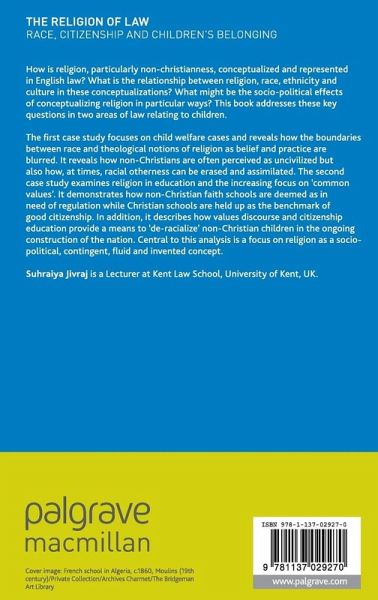 "The Religion of Law: Race, Citizenship and Children's Belonging, is a welcome addition to the overarching category of work which we might still describe loosely as law and religion but it is a book which has in its essence ideas of difference and distinction. ... this book is a detailed study of the many different ways in which religion might be constructed or conceptualized. ... Jivraj's book is rich and multilayered, weaving together many ideas and issues ... ." (Jane Mair, Feminist Legal Studies, Vol. 25, 2017)