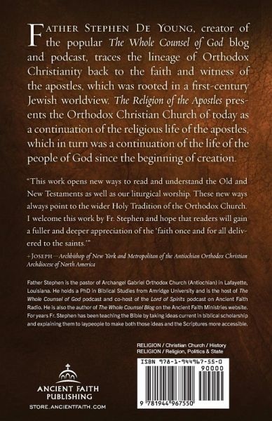 Father Stephen De Young, creator of the popular The Whole Counsel of God podcast and blog, traces the lineage of Orthodox Christianity back to the faith and witness of the apostles, which was rooted in a first-century Jewish worldview. The Religion of the Apostles presents the Orthodox Christian Church of today as a continuation of the religious life of the apostles, which in turn was a continuation of the life of the people of God since the beginning of creation.