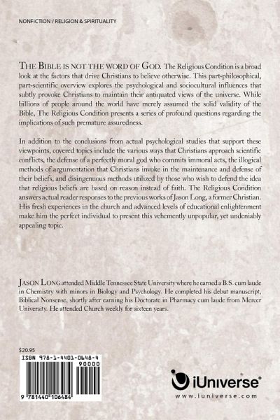The Bible is not the word of God. The Religious Condition is a broad look at the factors that drive Christians to believe otherwise. This part-philosophical, part-scientific overview explores the psychological and sociocultural influences that subtly provoke Christians to maintain their antiquated views of the universe. While billions of people around the world have merely assumed the solid validity of the Bible, The Religious Condition presents a series of profound questions regarding the implications of such premature assuredness. In addition to the conclusions from actual psychological studies that support these viewpoints, covered topics include the various ways that Christians approach scientific conflicts, the defense of a perfectly moral god who commits immoral acts, the illogical methods of argumentation that Christians invoke in the maintenance and defense of their beliefs, and disingenuous methods utilized by those who wish to defend the idea that religious beliefs are based on reason instead of faith. The Religious Condition answers actual reader responses to the previous works of Jason Long, a former Christian. His fresh experiences in the church and advanced levels of educational enlightenment make him the perfect individual to present this vehemently unpopular, yet undeniably appealing topic.