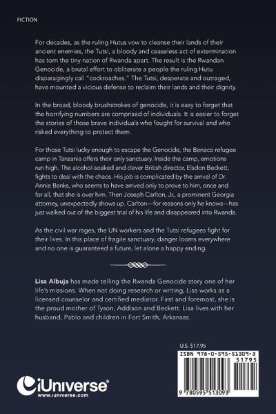 For decades, as the ruling Hutus vow to cleanse their lands of their ancient enemies, the Tutsi, a bloody and ceaseless act of extermination has torn the tiny nation of Rwanda apart. The result is the Rwandan Genocide, a brutal effort to obliterate a people the ruling Hutu disparagingly call "cockroaches." The Tutsi, desperate and outraged, have mounted a vicious defense to reclaim their lands and their dignity. In the broad, bloody brushstrokes of genocide, it is easy to forget that the horrifying numbers are comprised of individuals. It is easier to forget the stories of those brave individuals who fought for survival and who risked everything to protect them. For those Tutsi lucky enough to escape the Genocide, the Benaco refugee camp in Tanzania offers their only sanctuary. Inside the camp, emotions run high. The alcohol-soaked and clever British director, Elsdon Beckett, fights to deal with the chaos. His job is complicated by the arrival of Dr. Annie Banks, who seems to have arrived only to prove to him, once and for all, that she is over him. Then Joseph Carlton, Jr., a prominent Georgia attorney, unexpectedly shows up. Carlton-for reasons only he knows-has just walked out of the biggest trial of his life and disappeared into Rwanda. As the civil war rages, the UN workers and the Tutsi refugees fight for their lives. In this place of fragile sanctuary, danger looms everywhere and no one is guaranteed a future, let alone a happy ending.