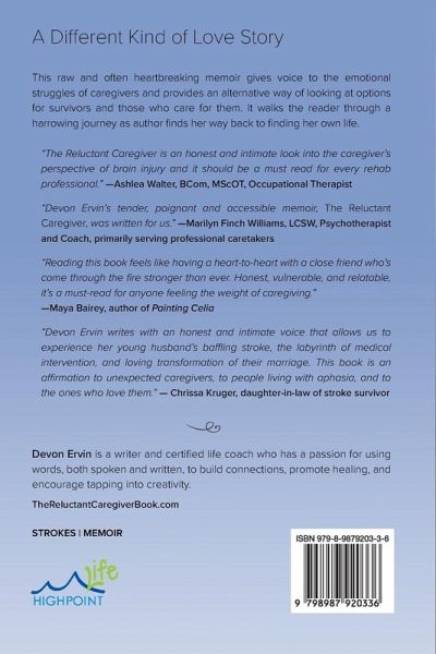 A different kind of love story This raw and often heartbreaking memoir gives voice to the emotional struggles of caregivers and provides an alternative way of looking at options for survivors and those who care for them. It walks the reader through a harrowing journey as author finds her way back to finding her own life. Devon Ervin shares a collection of stories and poems about the days, months, and years following her husband's brain injuries and how those moments impacted her, their marriage, and their family. It tells the somewhat universal (and often unspoken) story of the life of a caregiver, walking the reader through a harrowing journey as she finds her way back to being the author of her own life. This raw and often heartbreaking memoir gives voice to the emotional struggles of caregivers and provides an alternative way of looking at options for survivors and those who care for them. It centers the well-being of both parties so they can create lives that are mutually fulfilling, even if done in non-traditional ways. _________________________________________________________ "A gripping memoir about the advantages of choosing self-care, even when it rocks our closest relationships." -Grace Kerina, author of Personal Boundaries for Highly Sensitive People ¿"The Reluctant Caregiver is an honest and intimate look into the caregiver's perspective of brain injury and it should be a must read for every rehab professional." - Ashlea Walter, BCom, MScOT, Occupational Therapist "Devon Ervin's tender, poignant and accessible memoir, The Reluctant Caregiver, was written for us.¿" - Marilyn Finch Williams, LCSW, Psychotherapist and Coach, primarily serving professional caretakers "Reading this book feels like having a heart-to-heart with a close friend who's come through the fire stronger than ever. Honest, vulnerable, and relatable, it's a must-read for anyone feeling the weight of caregiving." - Maya Bairey, author of Painting Celia ¿"Devon Ervin writes with an honest and intimate voice that allows us to experience her young husband's baffling stroke, the labyrinth of medical intervention, and loving transformation of their marriage. This book is an affirmation to unexpected caregivers, to people living with aphasia, and to the ones who love them." - Chrissa Kruger, daughter-in-law of stroke survivor