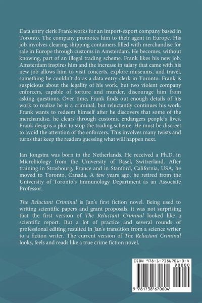 Frank has a low-level administrative job in an import-export company based in Toronto. Unexpectedly, the company promotes him to be their agent in Europe. His job involves clearing shipping containers through customs in Amsterdam. The containers are filled with merchandise for sale in Europe and Frank becomes, without knowing, part of an illegal trading scheme. Living in Amsterdam thrills Frank and he enjoys his new job, his apartment in downtown Amsterdam, and the increase in his salary. This allows him to visit concerts, explore museums, and travel Europe. Frank becomes suspicious about his work, but two violent company enforcers discourage him from asking questions. Over time, Frank discovers enough about the nature of the merchandise that he realizes he has become a criminal. For a while, Frank continues his job. He is reluctant to give up his dream job and return to Toronto. However, after some time, he wants to break with his criminal activities and designs a plot to stop the illegal trade. In doing so, Frank must avoid the attention of the company enforcers. This involves many twists and turns that keep the readers guessing.