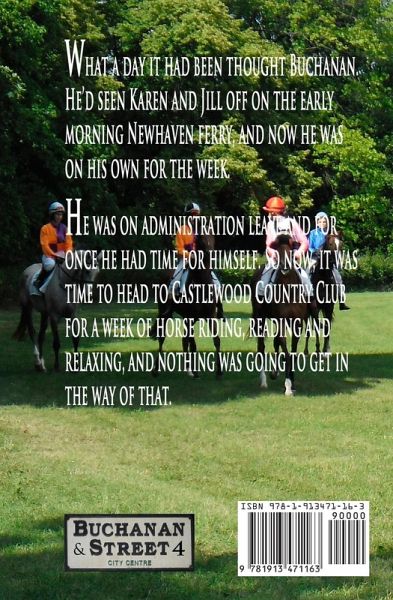 DCI Buchanan is on administration leave and is staying at Castlewood Country Club. He’d seen his wife and daughter off to France on the ferry and now planned to spend the week relaxing, reading, horse riding, and sipping his favourite single malt; and come hell or high water nothing was going to get in the way of that. But he hadn’t reckoned on what mayhem the whirlwind called Cynthia Mountjoy was about to cause.