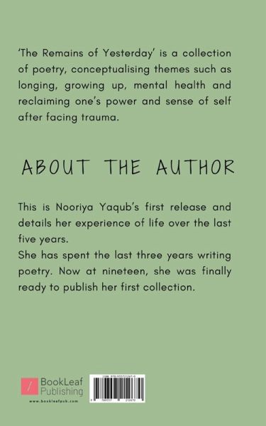 'The Remains of Yesterday' is a collection of poetry, conceptualising themes such as longing, growing up, mental health and reclaiming one's power and sense of self after facing trauma.