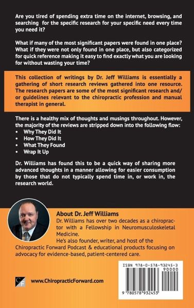 Are you tired of spending extra time on the internet, browsing, and searching for the specific research for your specific need every time you need it? What if many of the most significant papers were found in one place? What if they were not only found in one place, but also categorized for quick reference making it easy to find exactly what you are looking for without wasting your time? This collection of writings by Dr. Jeff Williams is essentially a gathering of short research reviews gathered into one resource. The research papers are some of the most significant research and/or guidelines relevant to the chiropractic profession and manual therapists in general. There is a healthy mix of thoughts and musings throughout. However, the majority of the reviews are stripped down into the following flow:Why They Did It How They Did It What They Found Wrap It Up Dr. Williams has found this to be a quick way of sharing more advanced thoughts in a manner allowing for easier consumption by those that do not typically spend time in, or work in, the research world.