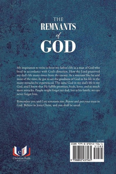 My inspiration to write is from my father's life as a man of God who lived in accordance with God's direction. How the Lord preserved my dad's life many times from the enemy. As a remnant like he said most of the time, he got to see the goodness of God in his life in the many miracles he experienced. The same God in my dad's life is my God, and I know that He fulfills promises, heals, loves, and so much more miracles. People might forget my dad, but as his family, we can never forget him. Remember you and I are remnants too. Repent and put your trust in God. Believe in Jesus Christ, and you shall be saved.