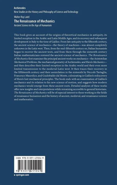 This book gives an account of the origins of theoretical mechanics in antiquity, its limited reception in the Arabic and Latin Middle Ages, and its recovery and subsequent development in Italy to the time of Galileo. From late antiquity to the fifteenth century, the ancient science of mechanics-the theory of machines-was almost completely unknown in the Latin west. Then, from the mid-fifteenth century on, Italian humanists began to recover the ancient texts, and from them through the sixteenth century Italian mathematicians restored the ancient science of mechanics. The Renaissance of Mechanics first examines the principal ancient works on mechanics-the Aristotelian Mechanical Problems, the mechanical geometry of Archimedes, and Hero's Mechanics-and then describes their limited reception in the Arabic world and their even more limited transmission to the medieval Latin west. It then traces their recovery in the fifthteenth century and their assimilation inthe sixteenth by Niccolò Tartaglia, Francesco Maurolico, and Guidobaldo dal Monte, culminating in Galileo's rediscovery of Hero's lost mechanical principles. The book ends with an examination of Galileo's mechanics and its relation to his new science of motion, and suggests how modern mechanics would emerge from these ancient roots. Detailed analyses of these works offer new insights and interpretations while remaining accessible to general historians. The Renaissance of Mechanics will be of especial interest to those working in the fields of renaissance humanism and the history of ancient, medieval, and renaissance science and mathematics.