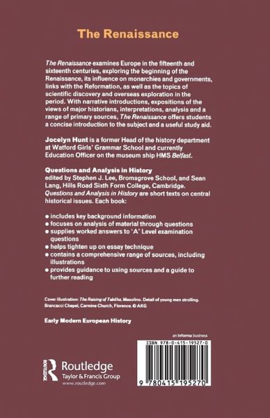 The Renaissance presents the panorama of Europe in the fifteenth and sixteenth centuries, exploring such themes as: the origins and causes of humanism Renaissance monarchies the Reformation geographical exploration science artistic movements. The book includes narrative introductions to each issue, views of major historians, interpretations, analysis and evaluation of primary sources.