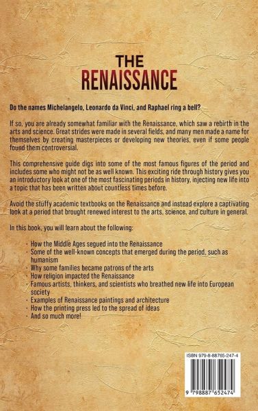 Do the names Michelangelo, Leonardo da Vinci, and Raphael ring a bell? If so, you are already somewhat familiar with the Renaissance, which saw a rebirth in the arts and science. Great strides were made in several fields, and many men made a name for themselves by creating masterpieces or developing new theories, even if some people found them controversial. This comprehensive guide digs into some of the most famous figures of the period and includes some who might not be as well known. This exciting ride through history gives you an introductory look at one of the most fascinating periods in history, injecting new life into a topic that has been written about countless times before. Avoid the stuffy academic textbooks on the Renaissance and instead explore a captivating look at a period that brought renewed interest to the arts, science, and culture in general. In this book, you will learn about the following: How the Middle Ages segued into the Renaissance Some of the well-known concepts that emerged during the period, such as humanism Why some families became patrons of the arts How religion impacted the Renaissance Famous artists, thinkers, and scientists who breathed new life into European society Examples of Renaissance paintings and architecture How the printing press led to the spread of ideas And so much more!