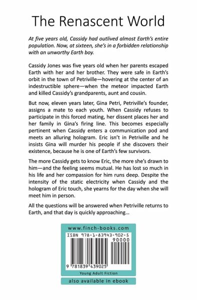 At five years old, Cassidy had outlived almost Earth’s entire population. Now, at sixteen, she’s in a forbidden relationship with an unworthy Earth boy. Cassidy Jones was five years old when her parents escaped Earth with her and her brother. They were safe in Earth’s orbit in the town of Petriville—hovering at the center of an indestructible sphere—when the meteor impacted Earth and killed Cassidy’s grandparents, aunt and cousin. But now, eleven years later, Gina Petri, Petriville’s founder, assigns a mate to each youth. When Cassidy refuses to participate in this forced mating, her dissent places her and her family in Gina’s firing line. This becomes especially pertinent when Cassidy enters a communication pod and meets an alluring hologram. Eric isn’t in Petriville and he insists Gina will murder his people if she discovers their existence, because he is one of Earth’s few survivors. The more Cassidy gets to know Eric, the more she’s drawn to him—and the feeling seems mutual. He has lost so much in his life and her compassion for him runs deep. Despite the intensity of the static electricity when Cassidy and the hologram of Eric touch, she yearns for the day when she will meet him in person. All the questions will be answered when Petriville returns to Earth, and that day is quickly approaching…