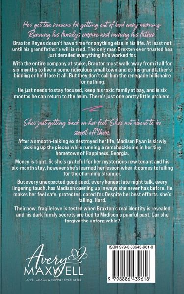 He's got two reasons for getting out of bed every morning: Running his family's empire and ruining his father. Braxton Reyes doesn't have time for anything else in his life. At least not until his grandfather's will is read. The only man Braxton ever trusted has just derailed everything he's worked for. With the entire company at stake, Braxton must walk away from it all for six months to live in some ridiculous small town and do his grandfather's bidding or he'll lose it all. But they don't call him the renegade billionaire for nothing. He just needs to stay focused, keep his toxic family at bay, and in six months he can return to the helm. There's just one pretty little problem. *** She's just getting back on her feet. She's not about to be swept off them. After a smooth-talking ex destroyed her life, Madison Ryan is slowly picking up the pieces while running a ramshackle inn in her tiny hometown of Happiness, Georgia. Money is tight. So she's grateful for her mysterious new tenant and his six-month stay, however she's learned her lesson when it comes to falling for the charming stranger. But every unexpected good deed, every honest late-night talk, every lingering touch, has Madison opening up in ways she never has before. He makes her feel safe, protected, cared for. Despite her best efforts, she's falling. Hard. Their new, fragile love is tested when Braxton's real identity is revealed and his dark family secrets are tied to Madison's painful past. Can she forgive the unforgivable?