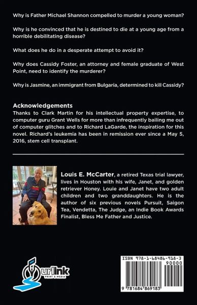 Why is Father Michael Shannon compelled to murder a young woman? Why is he convinced that he is destined to die at a young age from a horrible debilitating disease? What does he do in a desperate attempt to avoid it? Why does Cassidy Foster, an attorney and female graduate of West Point, need to identify the murderer? Why is Jasmine, an immigrant from Bulgaria, determined to kill Cassidy? Acknowledgements Thanks to Clark Martin for his intellectual property expertise, to computer guru Grant Wells for more than infrequently bailing me out of computer glitches and to Richard LaGarde, the inspiration for this novel. Richard's leukemia has been in remission ever since a May 5, 2016, stem cell transplant.