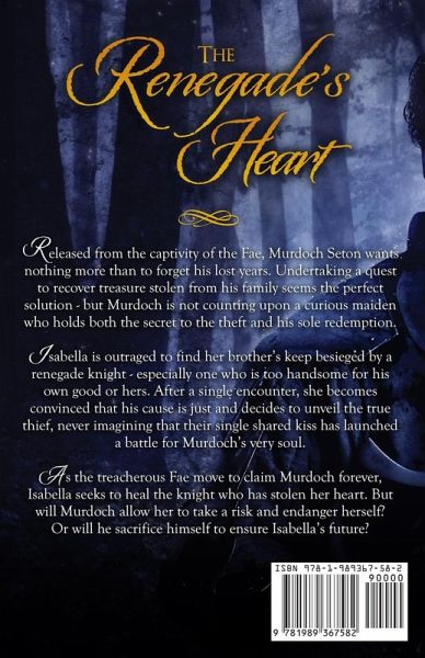 Released from the captivity of the Fae, Murdoch Seton wants nothing more than to forget his lost years. Undertaking a quest to recover treasure stolen from his family seems the perfect solution - but Murdoch is not counting upon a curious maiden who holds both the secret to the theft and his sole redemption. Isabella is outraged to find her brother's keep besieged by a renegade knight - especially one who is too handsome for his own good or hers. After a single encounter, she becomes convinced that his cause is just and decides to unveil the true thief, never imagining that their single shared kiss has launched a battle for Murdoch's very soul. As the treacherous Fae move to claim Murdoch forever, Isabella seeks to heal the knight who has stolen her heart. But will Murdoch allow her to take a risk and endanger herself? Or will he sacrifice himself to ensure Isabella's future?