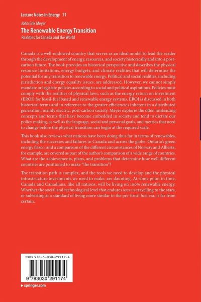 Canada is a well-endowed country that serves as an ideal model to lead the reader through the development of energy, resources, and society historically and into a post-carbon future. The book provides an historical perspective and describes the physical resource limitations, energy budgets, and climate realities that will determine the potential for any transition to renewable energy. Political and social realities, including jurisdiction and energy equality issues, are addressed. However, we cannot simply mandate or legislate policies according to social and political aspirations. Policies must comply with the realities of physical laws, such as the energy return on investment (EROI) for fossil-fuel based and renewable energy systems. EROI is discussed in both historical terms and in reference to the greater efficiencies inherent in a distributed generation, mainly electric, post-carbon society. Meyer explores the often misleading concepts and terms that have becomeembedded in society and tend to dictate our policy making, as well as the language, social and personal goals, and metrics that need to change before the physical transition can begin at the required scale.