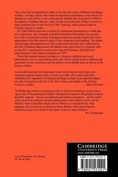 This is the first comprehensive study of the life and works of Muhammad Baqer as-Sadr - an Iraqi scholar who made an important contribution to the renewal of Islamic law and politics in the contemporary Middle East. Executed in 1980, Sadr was the most articulate thinker and a major political actor in the revival of Shi'i learning, which placed Najaf in Southern Iraq at its centre. Dr Chibli Mallat examines the intellectual development of Sadr and his companions who included Ruhullah al-Khumaini and assesses Sadr's innovative approaches to the study of law, economics and banking. The author convincingly demonstrates how Sadr's ideas and activities were influential in the rise of political Islam across the Middle East and played an important part in the Iranian revolution of 1979.