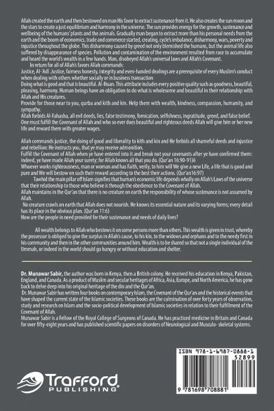 Allah created the earth and then bestowed on man His favor to extract sustenance from it. He also creates the sun moon and the stars to create a just equilibrium and harmony in the universe. The sun provides energy for the growth, sustenance and wellbeing of the humans' plants and the animals. Gradually man began to extract more than his personal needs from the earth and the boom of economics, trade and commerce started, creating, cycle's imbalance, disharmony, wars, poverty, and injustice throughout the globe. This disharmony caused by greed not only blemished the humans, but the animal life also suffered by disappearance of species. Pollution and contamination of the environment resulted from race to accumulate and hoard the world's wealth in a few hands. Man, disobeyed Allah's universal laws and Allah's Covenant. In return for all of Allah's favors Allah commands: Justice, Al-'Adl. Justice, fairness honesty, integrity and even-handed dealings are a prerequisite of every Muslim's conduct when dealing with others whether socially or in business transaction Doing what is good and that is beautiful. Al-Ihsan. This attribute includes every positive quality such as goodness, beautiful, pleasing, harmony. Human beings have an obligation to do what is wholesome and beautiful in their relationship with Allah and His creatures. Provide for those near to you, qurba and kith and kin. Help them with wealth, kindness, compassion, humanity, and sympathy. Allah forbids Al-Fahasha, all evil deeds, lies, false testimony, fornication, selfishness, ingratitude, greed, and false belief. One must fulfill the Covenant of Allah and who so ever does beautiful and righteous deeds Allah will give him or her new life and reward them with greater wages. Allah commands justice, the doing of good and liberality to kith and kin and He forbids all shameful deeds and injustice and rebellion: He instructs you, that ye may receive admonition. Fulfill the Covenant of Allah when ye have entered into it and break not your covenants after ye have confirmed them: indeed, ye have made Allah your surety; for Allah knows all that you do. (Qur'an 16:90-91)ô Whoever works righteousness, man or woman and has Faith, verily, to him will We give a new Life, a life that is good and pure and We will bestow on such their reward according to the best their actions. (Qur'an16:97) Tawhid the main pillar off Islam signifies that human's economic life depends wholly on Allah's Laws of the universe that their relationship to those who believe is through the obedience to the Covenant of Allah. Allah maintains in the Qur'an that there is no creature on earth the responsibility of whose sustenance is not assumed by Allah. No creature crawls on earth that Allah does not nourish. He knows its essential nature and its varying forms; every detail has its place in the obvious plan. (Qur'an 11:6) How are the people in need provided for their sustenance and needs of daily lives? All wealth belongs to Allah who bestows it on some persons more than others. This wealth is given in trust, whereby the possessor is obliged to give the surplus in Allah's cause, to his kin, to the widows and orphans and to the needy first in his community and then in the other communities around him. Wealth is to be shared so that not a single individual of the Ummah, or indeed in the world should go hungry or without education and shelter.