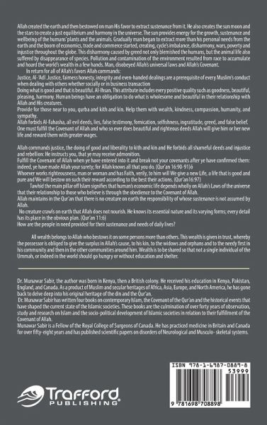 Allah created the earth and then bestowed on man His favor to extract sustenance from it. He also creates the sun moon and the stars to create a just equilibrium and harmony in the universe. The sun provides energy for the growth, sustenance and wellbeing of the humans' plants and the animals. Gradually man began to extract more than his personal needs from the earth and the boom of economics, trade and commerce started, creating, cycle's imbalance, disharmony, wars, poverty, and injustice throughout the globe. This disharmony caused by greed not only blemished the humans, but the animal life also suffered by disappearance of species. Pollution and contamination of the environment resulted from race to accumulate and hoard the world's wealth in a few hands. Man, disobeyed Allah's universal laws and Allah's Covenant. In return for all of Allah's favors Allah commands: Justice, Al-'Adl. Justice, fairness honesty, integrity and even-handed dealings are a prerequisite of every Muslim's conduct when dealing with others whether socially or in business transaction Doing what is good and that is beautiful. Al-Ihsan. This attribute includes every positive quality such as goodness, beautiful, pleasing, harmony. Human beings have an obligation to do what is wholesome and beautiful in their relationship with Allah and His creatures. Provide for those near to you, qurba and kith and kin. Help them with wealth, kindness, compassion, humanity, and sympathy. Allah forbids Al-Fahasha, all evil deeds, lies, false testimony, fornication, selfishness, ingratitude, greed, and false belief. One must fulfill the Covenant of Allah and who so ever does beautiful and righteous deeds Allah will give him or her new life and reward them with greater wages. Allah commands justice, the doing of good and liberality to kith and kin and He forbids all shameful deeds and injustice and rebellion: He instructs you, that ye may receive admonition. Fulfill the Covenant of Allah when ye have entered into it and break not your covenants after ye have confirmed them: indeed, ye have made Allah your surety; for Allah knows all that you do. (Qur'an 16:90-91)ô Whoever works righteousness, man or woman and has Faith, verily, to him will We give a new Life, a life that is good and pure and We will bestow on such their reward according to the best their actions. (Qur'an16:97) Tawhid the main pillar off Islam signifies that human's economic life depends wholly on Allah's Laws of the universe that their relationship to those who believe is through the obedience to the Covenant of Allah. Allah maintains in the Qur'an that there is no creature on earth the responsibility of whose sustenance is not assumed by Allah. No creature crawls on earth that Allah does not nourish. He knows its essential nature and its varying forms; every detail has its place in the obvious plan. (Qur'an 11:6) How are the people in need provided for their sustenance and needs of daily lives? All wealth belongs to Allah who bestows it on some persons more than others. This wealth is given in trust, whereby the possessor is obliged to give the surplus in Allah's cause, to his kin, to the widows and orphans and to the needy first in his community and then in the other communities around him. Wealth is to be shared so that not a single individual of the Ummah, or indeed in the world should go hungry or without education and shelter.