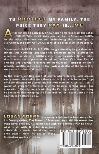 TO PROTECT MY FAMILY, THE PRICE THE PAY IS ... ME. After America's collapse, a new nation emerged from the ashes - NOMISMAN, its 20 cities governed by the AI system, AURA. In the elite Newtown sectors, maintaining the status quo is everything, and defying AURA's control is a clear mark of treachery. Sixteen-year-old EZARIAH MALKIN thought attending his grandmother's funeral was harmless. But when the Enforcers arrive to arrest the mourners for defying AURA's algorithm, Ezariah's father takes drastic measures to preserve his influential family's status. Ezariah and his two younger brothers are Renounced - stripped of their identity, wealth, and exiled to the lawless depths of the Slum they were raised to fear and revile. In the Slum's winding maze of alleys, where danger lurks around every corner, survival is more than a battle. Ezariah is forced to forge unlikely alliances to protect his brothers from its harsh realities - a world of smuggling, Enforcers, crime bosses, fighting rings, and starvation. His only hope is winning the Culling, a relocation lottery so exclusive that escaping the Slum may extract a cruel price - one Ezariah can't afford to pay.