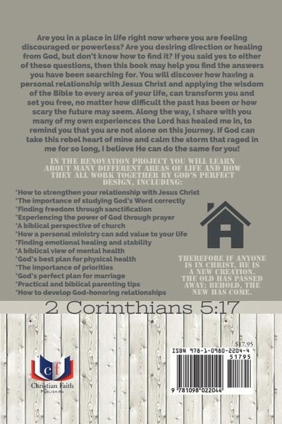 Are you in a place in life right now where you are feeling discouraged or powerless? Are you desiring direction or healing from God but don't know how to find it? If you said yes to either of these questions, then this book may help you find the answers you have been searching for. You will discover how having a personal relationship with Jesus Christ and applying the wisdom of the Bible to every area of your life can transform you and set you free, no matter how difficult the past has been or how scary the future may seem. Along the way, I share with you many of my own experiences the Lord has healed me in to remind you that you are not alone on this journey. If God can take this rebel heart of mine and calm the storm that raged in me for so long, I believe He can do the same for you! In The Renovation Project, you will learn about many different areas of life and how they all work together by God's perfect design, including: • How to strengthen your relationship with Jesus Christ; • The importance of studying God's Word correctly; • Finding freedom through sanctification; • Experiencing the power of God through prayer; • A biblical perspective of church; • How a personal ministry can add value to your life; • Finding emotional healing and stability; • A biblical view of mental health; • God's best plan for physical health; • The importance of priorities; • God's perfect plan for marriage; • Practical and biblical parenting tips; • How to develop God-honoring relationships.