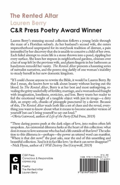 Lauren Berry’s stunning second collection follows a young bride through the maze of a Floridian suburb. As her husband’s second wife, she enters stepmotherhood unprepared for its storybook tradition of distrust, a pain intensified by her discovery that she is unable to conceive a child of her own. Each failed attempt to create life is a stone thrown into a pond, rippling her every surface. She loses her stepson in neighborhood gardens, obsesses over a bar of soap left by the previous wife, and plants lingerie in her bathroom as handymen remodel her vanity. The Rented Altar presents a haunting series of surrealist narratives, and the poems sing darkly of one woman’s inability to steady herself in her new domestic kingdom.
