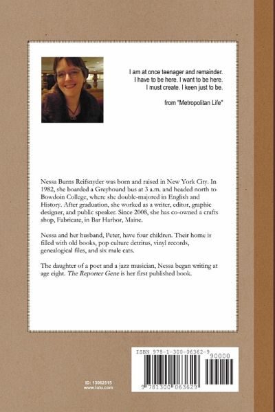 Spanning three decades of life experience, "The Reporter Gene" examines childhood, parenthood, loss, and the resonance of place. Readers familiar with the Atlantic states--its cities and deepest rural areas--will recognize the landscape of these works. Nessa Burns Reifsnyder, daughter of a poet and a jazz musician, inherited the "reporter gene" of the title: an unsparing, straightforward storytelling instinct, with flashes of emotional verve befitting an improviser.