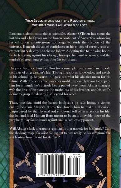 Then Seventh and last, the Requisite true, without whom all would be lost. Passionate about most things scientific, Alaster O'Brien has spent the last two and a half years on the frozen continent of Antarctica, advancing his education in astronomy and eager to study the vastness of the universe. Beneath the air of confidence in his choice of career, rests an extraordinary destiny he aches to follow. A destiny tied to the wing bones he feels resting against his ribcage, his superhuman-like senses, and the tendrils of green energy that obey his command. His parents expect him to follow his original plan and remain in the safe confines of a researcher's life. Though he craves knowledge, and excels in his schooling, he yearns to figure out what his abilities mean for his future. With protectors from another world desperately trying to prepare him for a mantle he's actively being pulled away from, Alaster struggles with the love of his parents, the tragic loss of his brother, and his soul's desire to grasp the destiny just beyond his reach. Then, one day, amid the barren landscape he calls home, a vicious enemy bent on Alaster's destruction forces him to make a decision. Unprepared for the physical and emotional toll of an attack on his life, the last and final Human-Born meant to be an unmovable piece of the prophecy may fail to stand against such a ruthless opponent. Will Alaster's lack of training result in further tragedy for his family? Can the shadowy wisp of a voice calling out to him really be his salvation? Or is it leading him toward his demise?
