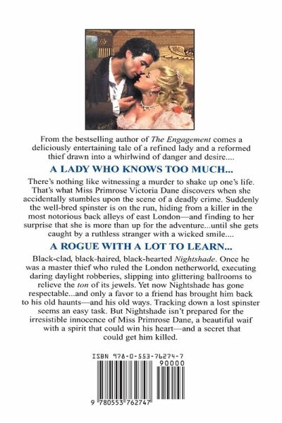 He was the last man she'd ever expect to come to... From the bestselling author of The Engagement comes a deliciously entertaining tale of a refined lady and a reformed thief drawn into a whirlwind of danger and desire.... A lady who knows too much... There's nothing like witnessing a murder to shake up one's life. That's what Miss Primrose Victoria Dane discovers when she accidentally stumbles upon the scene of a deadly crime. Suddenly the well-bred spinster is on the run, hiding from a killer in the most notorious back alleys of east London--and finding to her surprise that she is more than up for the adventure...until she gets caught by a ruthless stranger with a wicked smile.... A rogue with a lot to learn... Black-clad, black-haired, black-hearted Nightshade. Once he was a master thief who ruled the London netherworld, executing daring daylight robberies, slipping into glittering ballrooms to relieve the ton of its jewels. Yet now Nightshade has gone respectable...and only a favor to a friend has brought him back to his old haunts--and his old ways. Tracking down a lost spinster seems an easy task. But Nightshade isn't prepared for the irresistible innocence of Miss Primrose Dane, a beautiful waif with a spirit that could win his heart--and a secret that could get him killed.