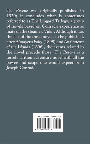 The Rescue was originally published in 1920; it concludes what is sometimes referred to as The Lingard Trilogy, a group of novels based on Conrad's experience as mate on the steamer, Vidar. Although it was the last of the three novels to be published, after Almayer's Folly (1895) and An Outcast of the Islands (1896), the events related in the novel precede those. The Rescue is a tersely written adventure novel with all the power and scope one would expect from Joseph Conrad.