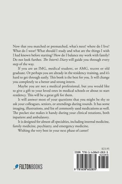 Now that you matched or prematched, what's next? where do I live? What do I wear? What should I study and what are the things I wish I had known before starting? How do I balance my work with family? Do not look further. The Intern's Diary will guide you through every step of the way. If you are an IMG, medical student, or AMG, recent or old graduate. Or perhaps you are already in the residency training, and it's hard to get through easily. This book is the best for you. It will change you completely to a better and strong intern. Maybe you are not a medical professional, but you would like to give a gift to your loved ones in medical schools or about to start residency. This will be a great gift for them. It will answer most of your questions that you might be shy to ask your colleagues, seniors, or attendings during rounds. It has some imaging, illustrations, and list of commonly used medications as well. The pocket size makes it handy during your clinical rotations, both inpatient and ambulatory. It is designed for almost all specialties, including internal medicine, family medicine, psychiatry, and emergency medicine. Wishing the very best in your next phase of career!