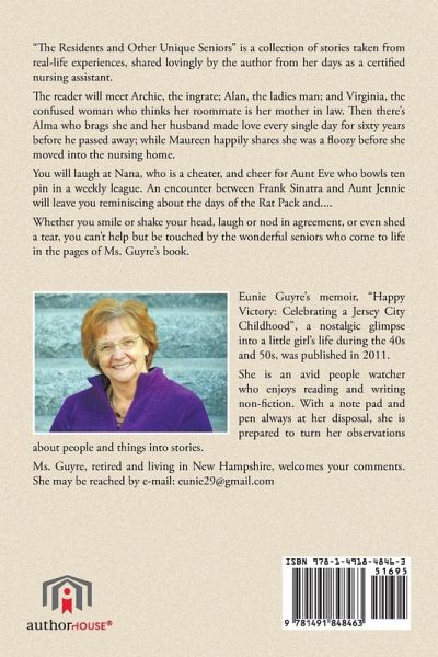 "The Residents and Other Unique Seniors" is a collection of stories taken from real-life experiences, shared lovingly by the author from her days as a certified nursing assistant. The reader will meet Archie, the ingrate; Alan, the ladies man; and Virginia, the confused woman who thinks her roommate is her mother in law. Then there's Alma who brags she and her husband made love every single day for sixty years before he passed away; while Maureen happily shares she was a floozy before she moved into the nursing home. You will laugh at Nana, who is a cheater, and cheer for Aunt Eve who bowls ten pin in a weekly league. An encounter between Frank Sinatra and Aunt Jennie will leave you reminiscing about the days of the Rat Pack and.... Whether you smile or shake your head, laugh or nod in agreement, or even shed a tear, you can't help but be touched by the wonderful seniors who come to life in the pages of Ms. Guyre's book.