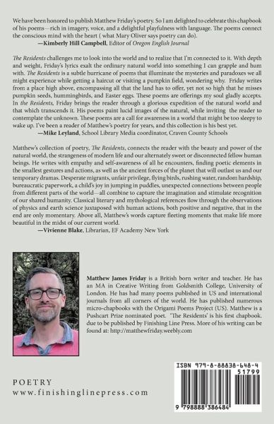 The Residents is Matthew Friday's first book of poetry. It begins with the author's arrival at the height of the COVID pandemic and explores his new life as a US resident. The poems reflect on this new journey and study what being a resident means for other people, flora and fauna of the Pacific Northwest. While Oregon's inhabitants and landscape form the basis of many poems, others explore residency in a wider sense, crossing borders near and far away. Subjects range from barbers to hummingbirds, immigration headaches to territorial hawks, children splashing in puddles to bread-making with a father-in-law. Anyone who loves poetry that is concise yet descriptive, rich in images but with accessible language will want to read this book.